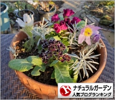 プリムラと翁草の寄せ植えは、花柄を摘み取り、少し寂しい状態になっていますが、翁草がスタンバイしています。
